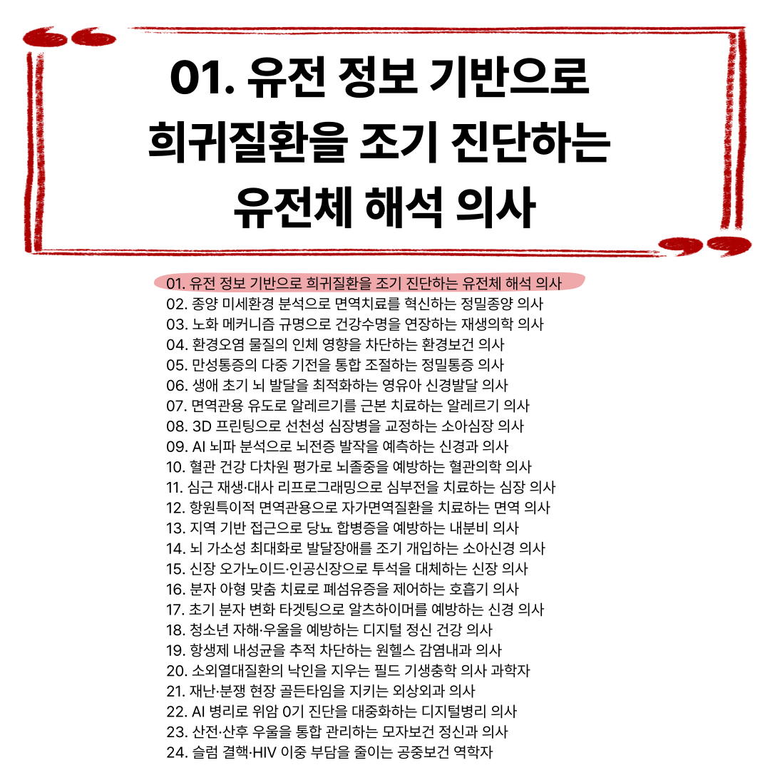 의대 탐구 전략서_왜 의사가 되려 하는가-합격을 결정짓는 24개 분야별 실전 탐구활동 설계 가이드' 중 "01. 유전 정보 기반으로 희귀질환을 조기 진단하는 유전체 해석 의사 편"입니다.
