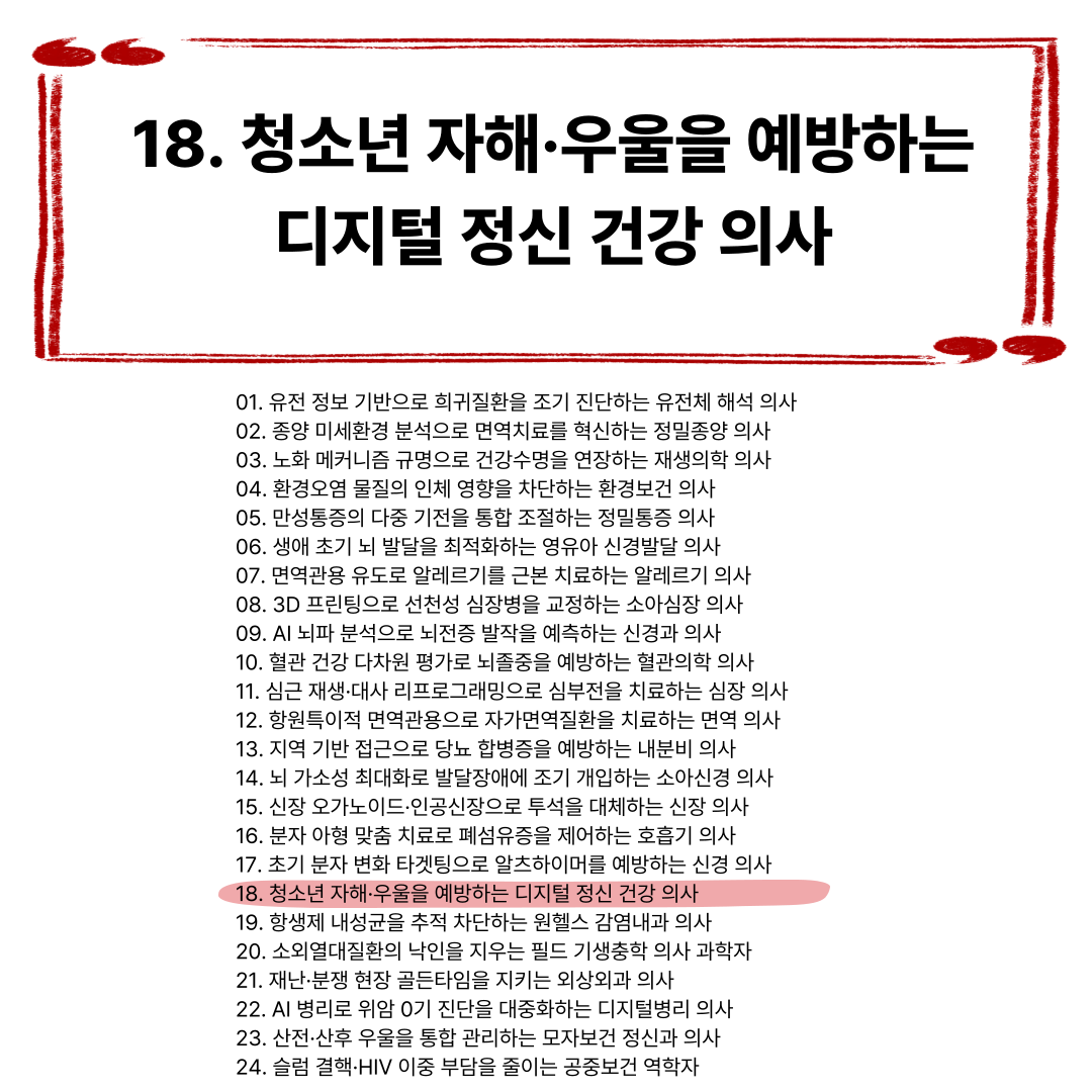 의대 탐구 전략서_왜 의사가 되려 하는가-합격을 결정짓는 24개 분야별 실전 탐구활동 설계 가이드' 중 "18. 청소년 자해·우울을 예방하는 디지털 정신 건강 의사' 편입니다.